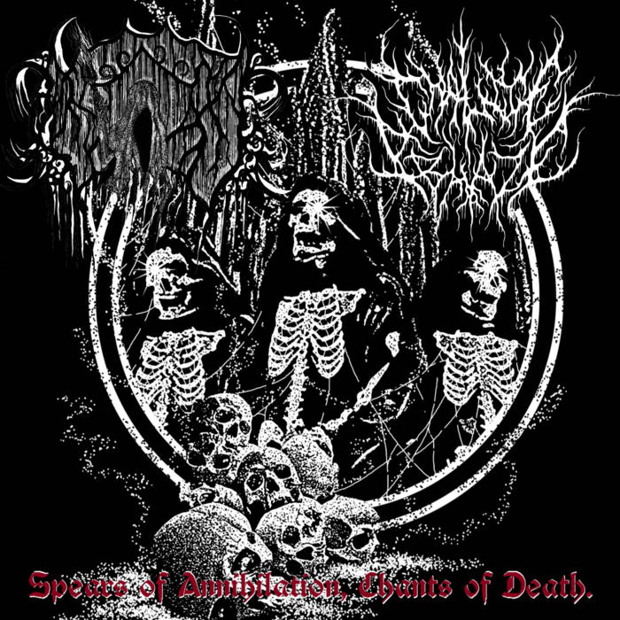 Spliten ‘Spears of Annihilation, Chants of Death’ er det tredje påfunnet til det ferske svartmetallprosjektet Chalice Ablaze, som i denne omgang har alliert seg med amerikanske Nebulous of Blood. Chalice Ablaze er et prosjekt jeg gjennom dets to tidligere utgivelser har utviklet en viss fascinasjon for – ikke nødvendigvis fordi all musikken er så voldsomt imponerende til enhver tid, men snarere fordi prosjektet stadig befinner seg i et interessant og krevende spenningspunkt mellom uhyre obskure trekk og mer eller mindre progressive tilnærminger til låtskriving. På papiret er Chalice Ablaze på mange måter et ganske typisk enmannsprosjekt innenfor svartmetallen, men samtidig er det selv innenfor dette sjangerlandskapet usedvanlig ekstremt i enkelte henseender – særlig når det gjelder å gjøre musikken virkelig ugjennomtrengelig og mørk.